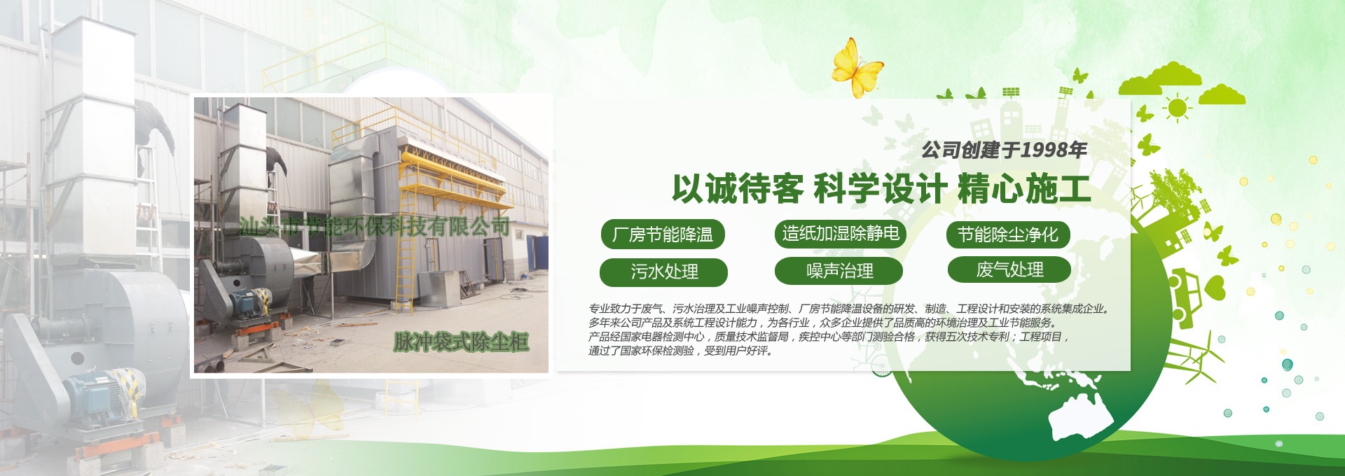 汕頭市節(jié)能環(huán)保科技有限公司創建于1998年,是一家專業致力于廢氣、污水、粉塵、噪聲治理,廠房節(jié)能降溫設備的研發(fā)、制造、工程設計和安裝的系統集成企業。多年來公司產品及系統工程設計能力,為各行業,眾多企業提供了品質高的環(huán)境治理及工業節(jié)能服務。產品經國家電器檢測中心,質量技術監(jiān)督局,疾控中心等部門測驗合格,獲得五次技術專利;工程項目通過了國家環(huán)保檢驗檢測,受到用戶好評。